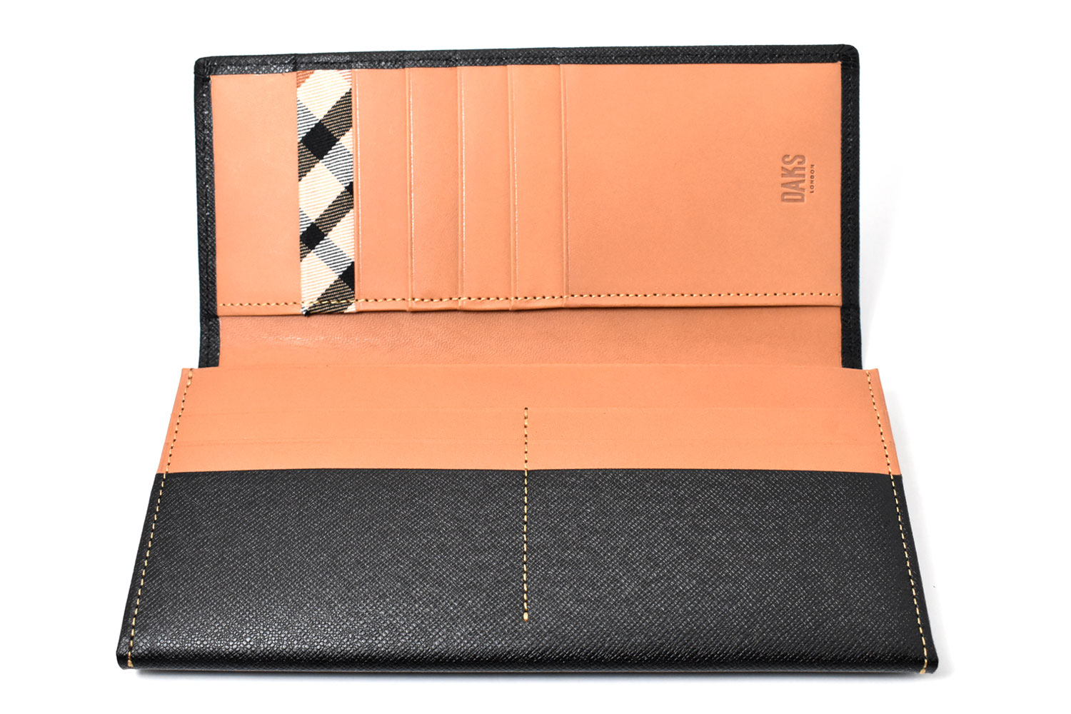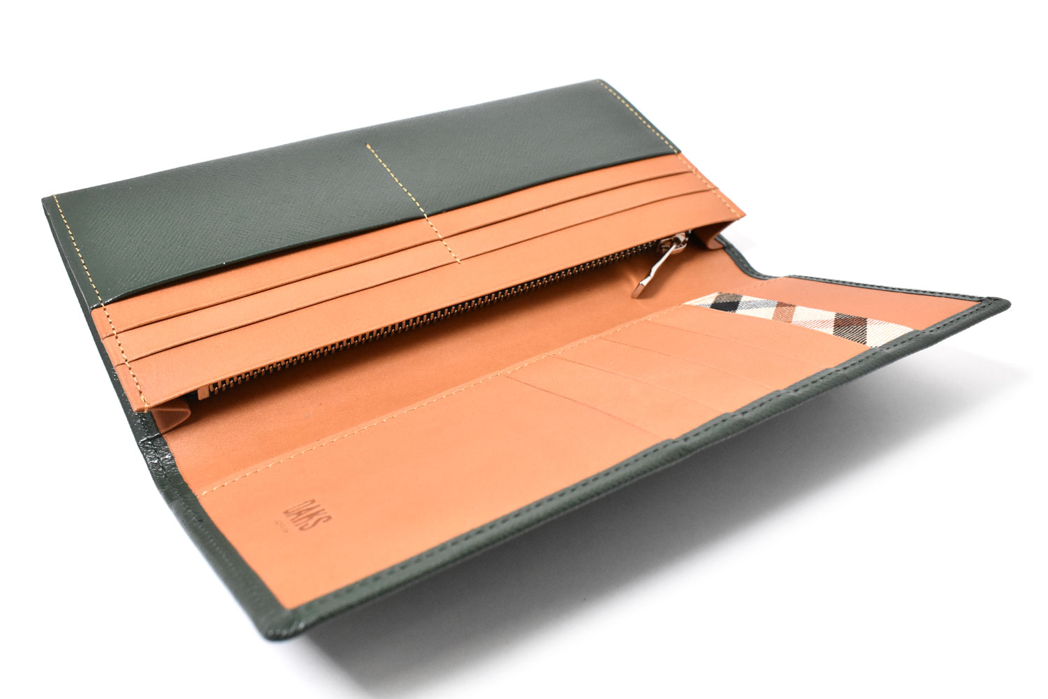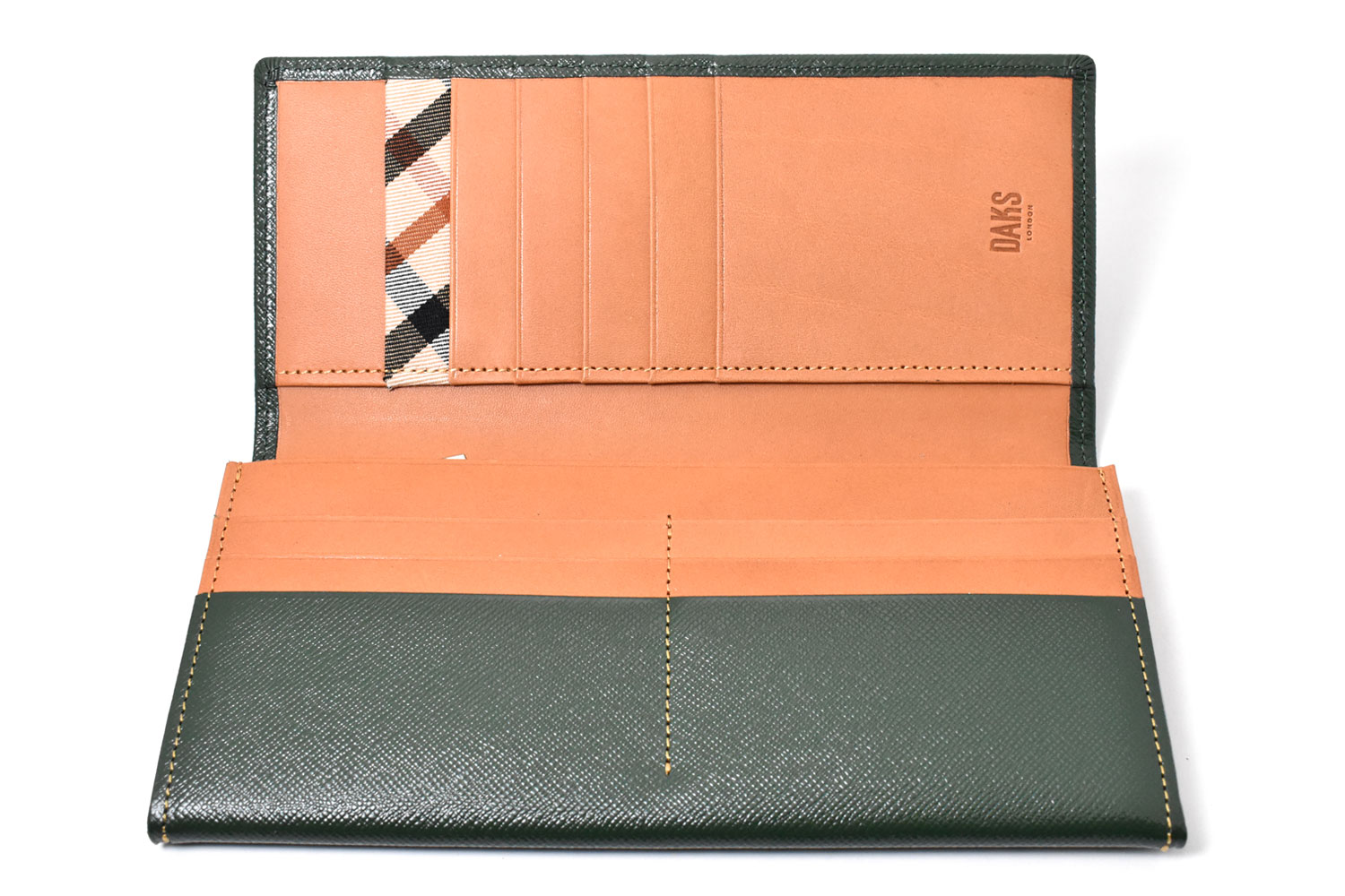 美しく輝く上品な光沢を放つエンボス革を使用、内作りには革本来の持つ力強い存在感をそのまま表現した植物タンニン仕上げのヌメ革を使っています。遊び心を演出するハウスチェックのカード段。気品溢れる表のDDロゴがアクセントになっています。