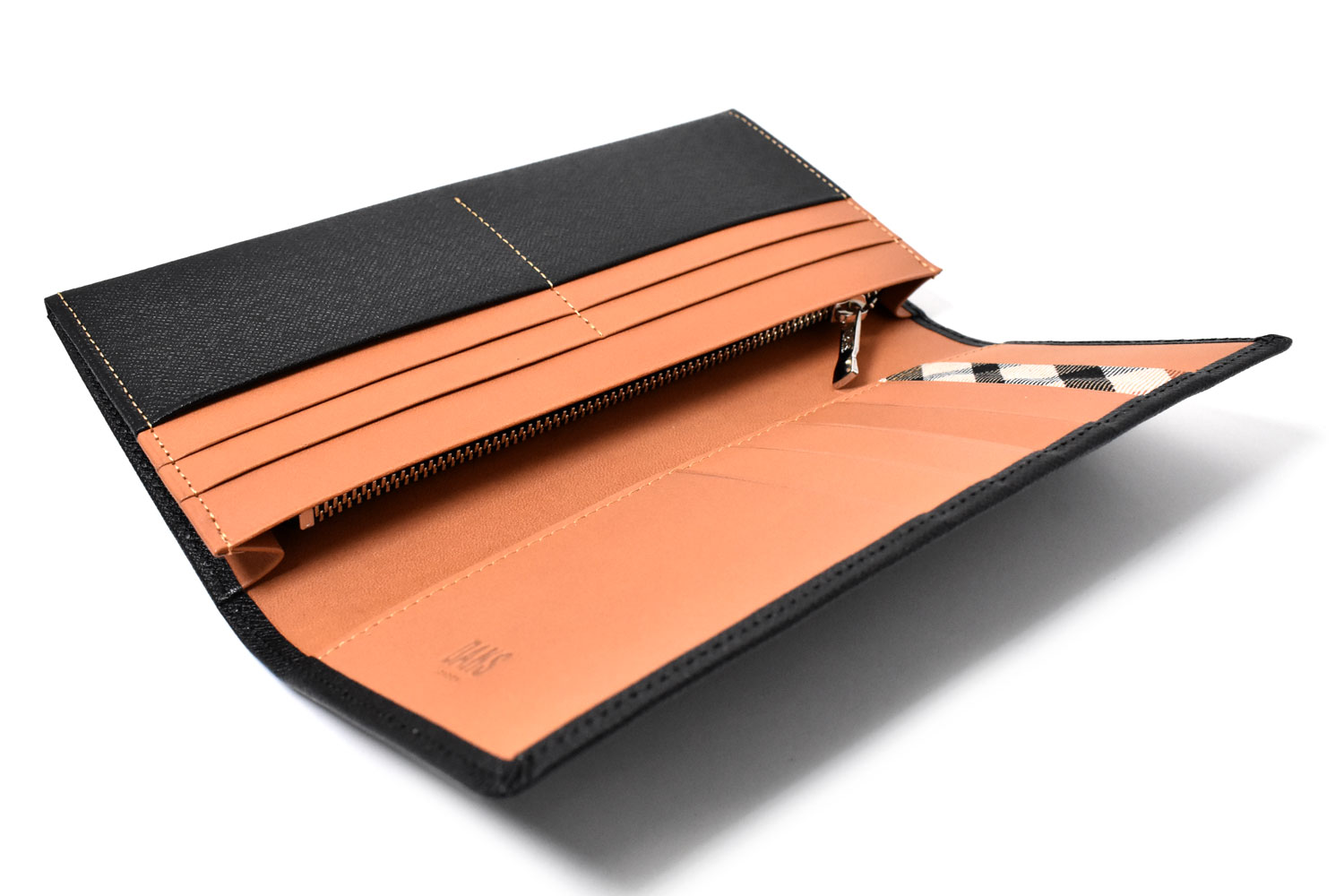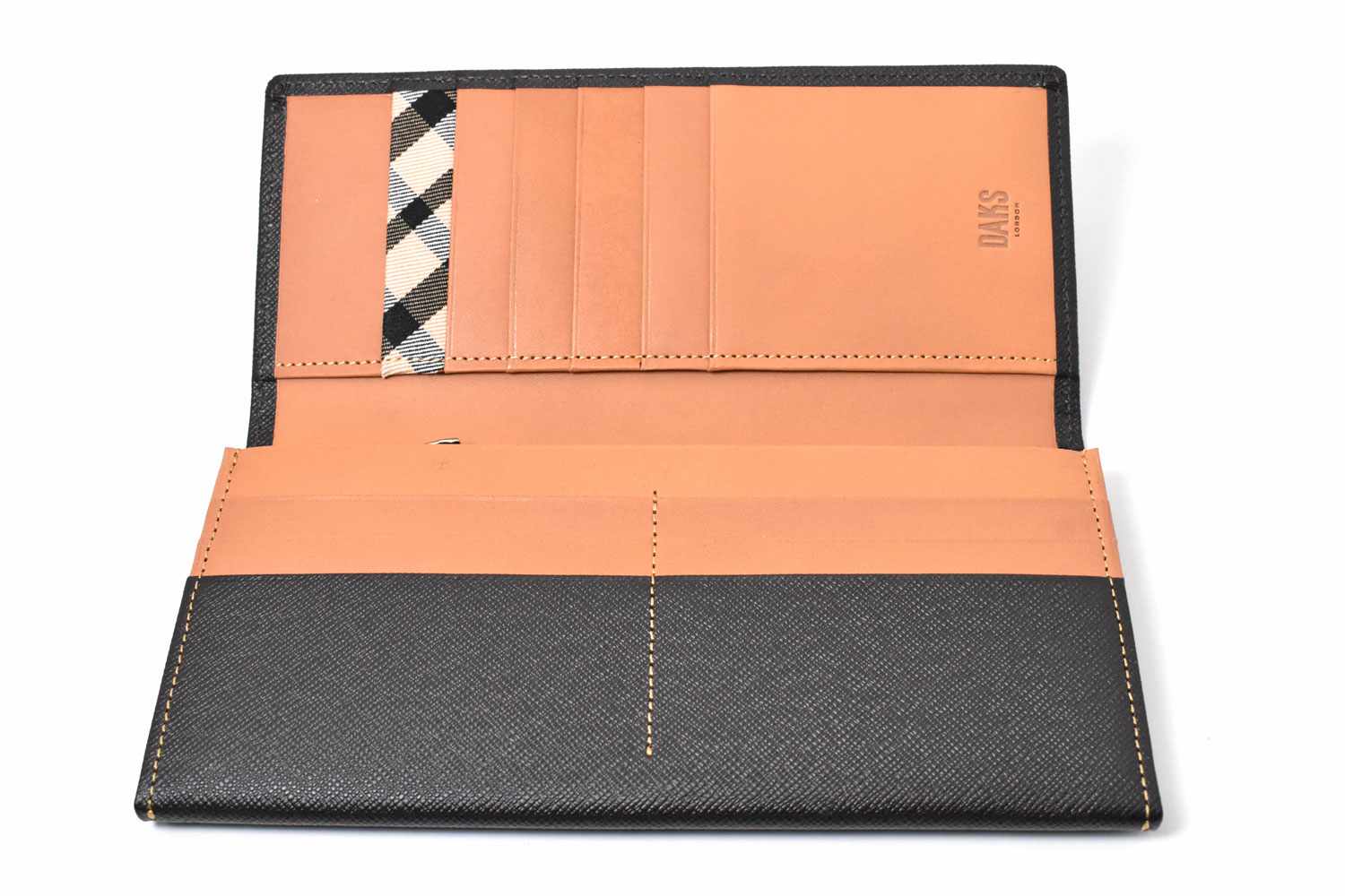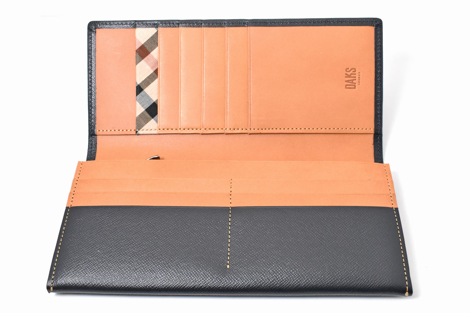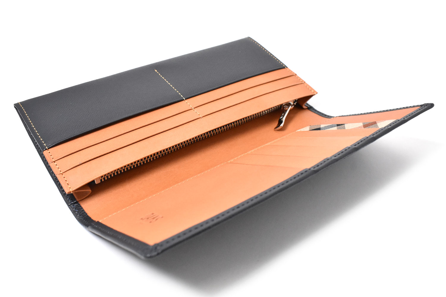 美しく輝く上品な光沢を放つエンボス革を使用、内作りには革本来の持つ力強い存在感をそのまま表現した植物タンニン仕上げのヌメ革を使っています。遊び心を演出するハウスチェックのカード段。気品溢れる表のDDロゴがアクセントになっています。