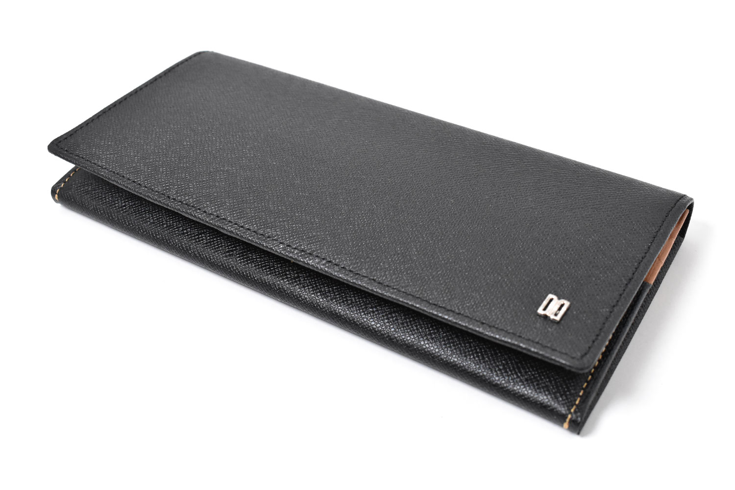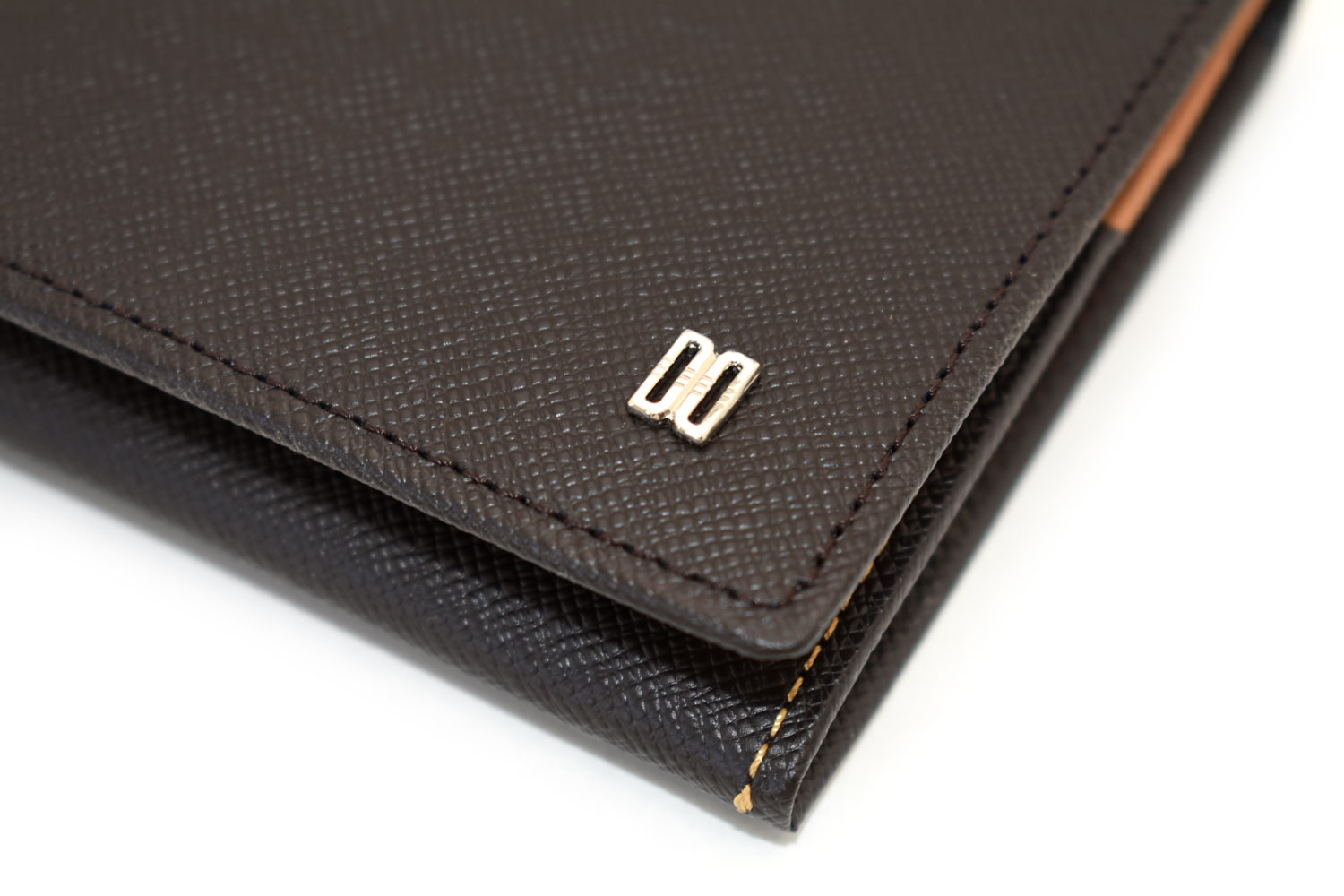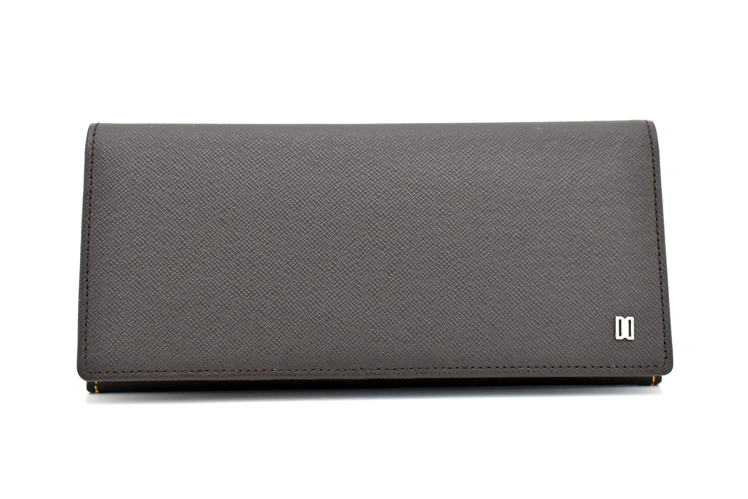 表のワンポイントブローチはダックス伝統のDDマークを金具のブローチにして配置。型押しのシャープなイメージとメタルのクールなイメージが、全体をスタイリッシュな印象にしています。