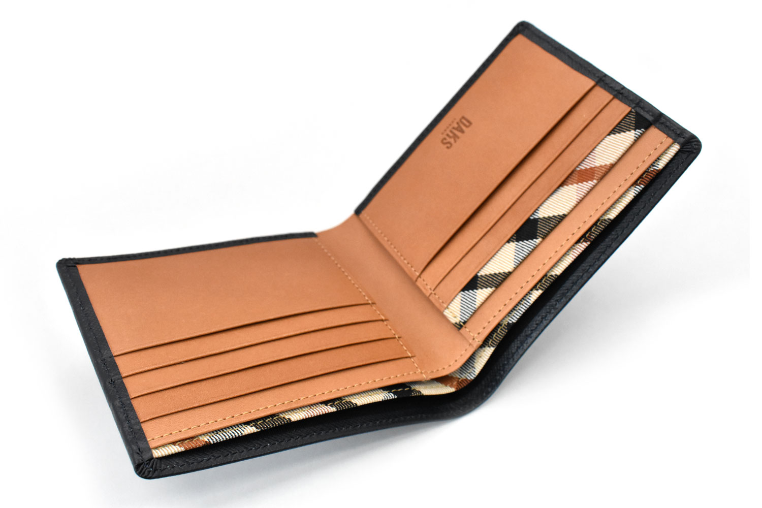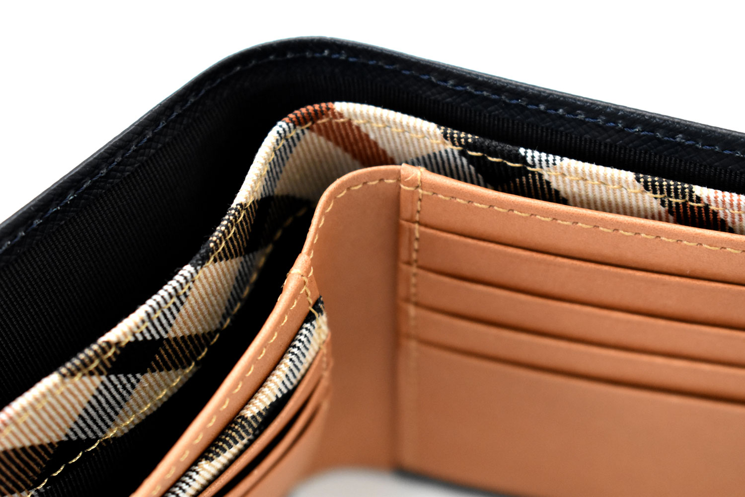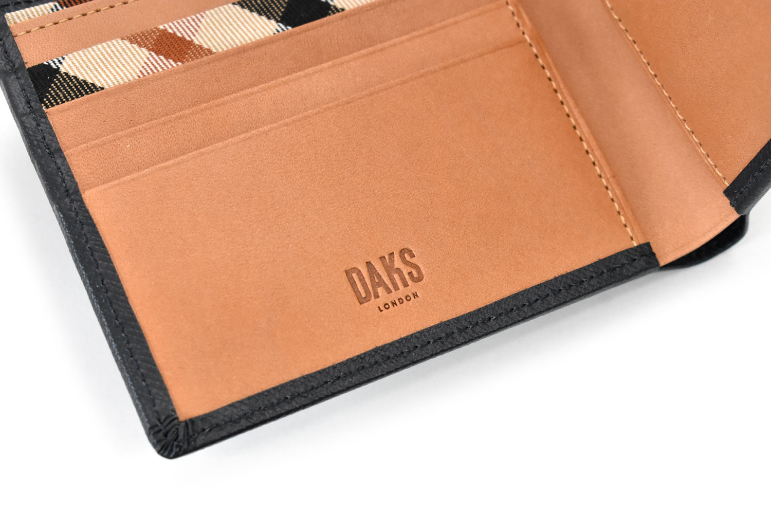カード段の一部、札室の仕切りにはダックス伝統のハウスチェック柄の生地を使用。さりげない隠れたおしゃれを演出しています。