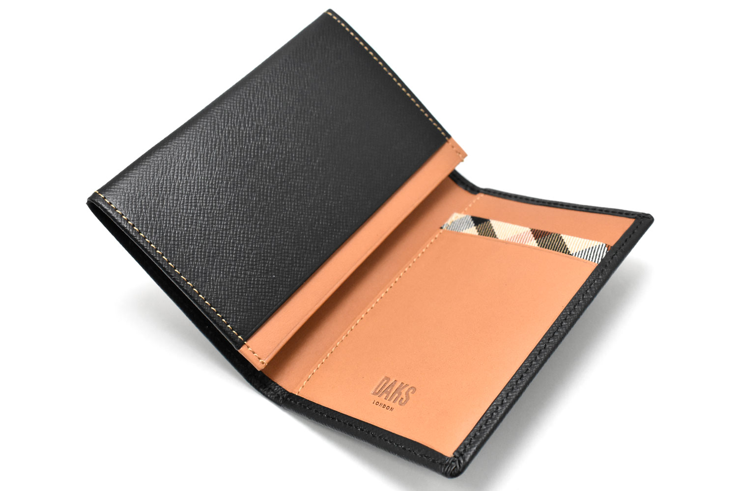 美しく輝く上品な光沢を放つエンボス革を使用、内作りには革本来の持つ力強い存在感をそのまま表現した植物タンニン仕上げのヌメ革を使っています。遊び心を演出するハウスチェックのカード段。気品溢れる表のDDロゴがアクセントになっています。