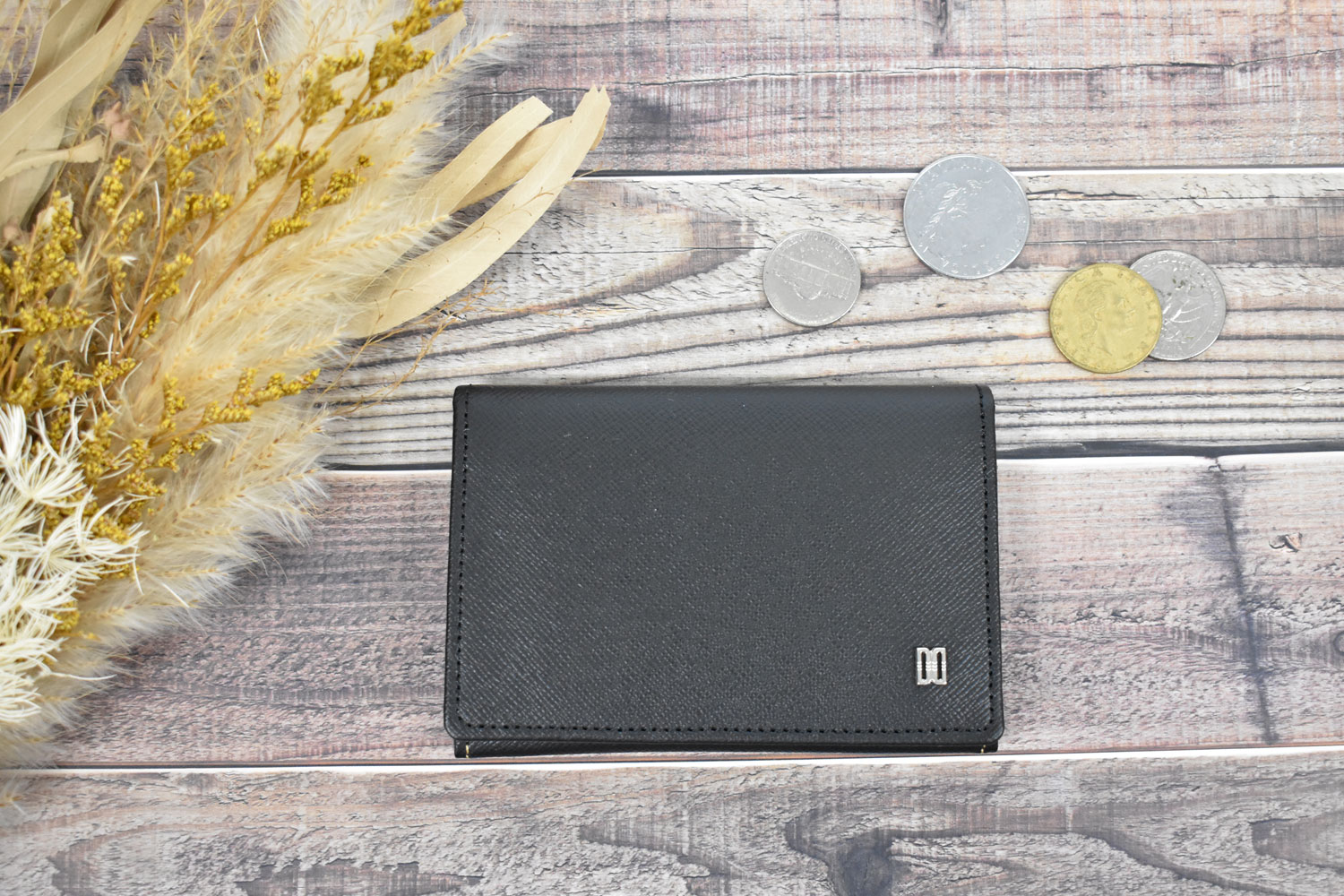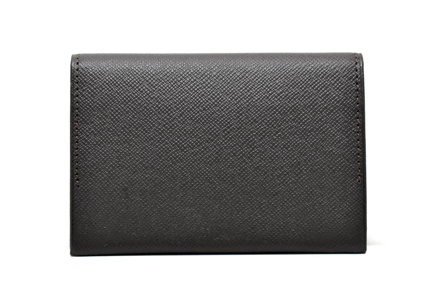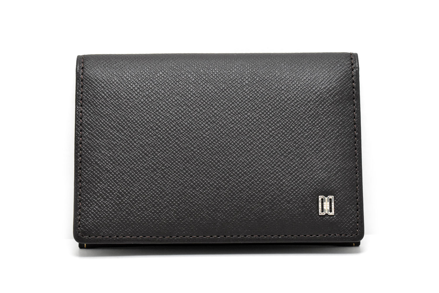 ベーシックなササマチの名刺入れ。ダックスのロゴブローチをあしらった、スタイリッシュなデザイン。細かい型押しを施したレザーはキズが付きにくい特徴があります。