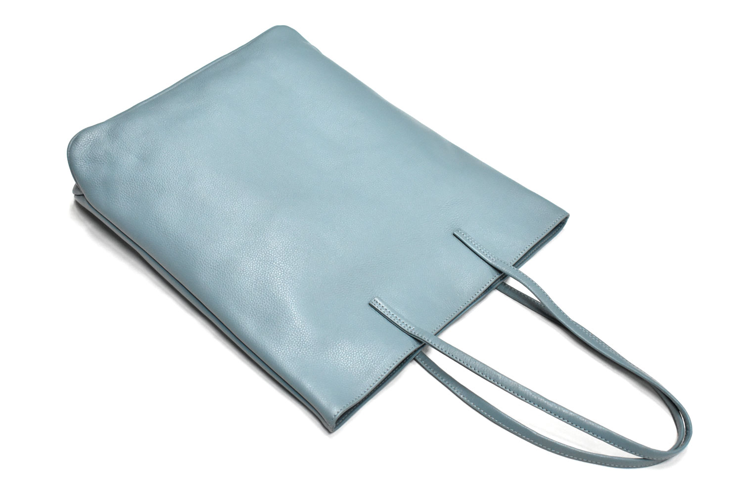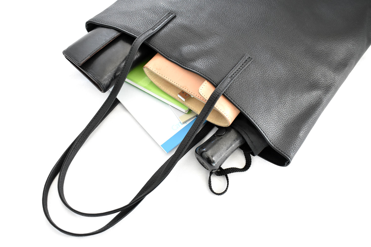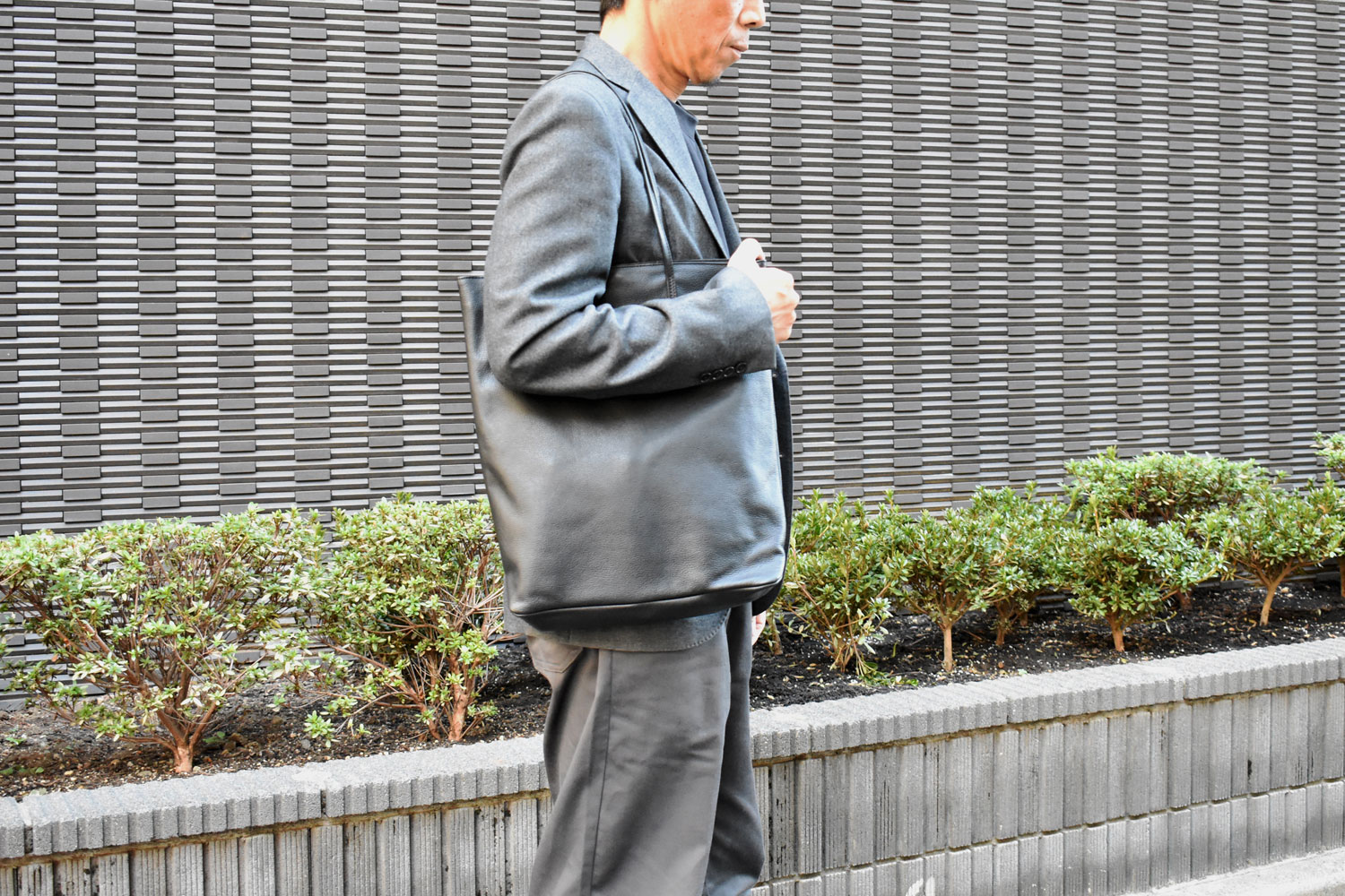 すらりとした縦長のフォルムがきれいなトートバッグ。表地にはシボ感が美しく、傷がつきにくいレザーを使用しています。裏面には表と同色のライニングが使われていて、優しく上品な佇まいながら、休日のカジュアルな格好にも合わせやすいデザインに仕上げています。持ち手が長く、肩掛けできるサイズです。