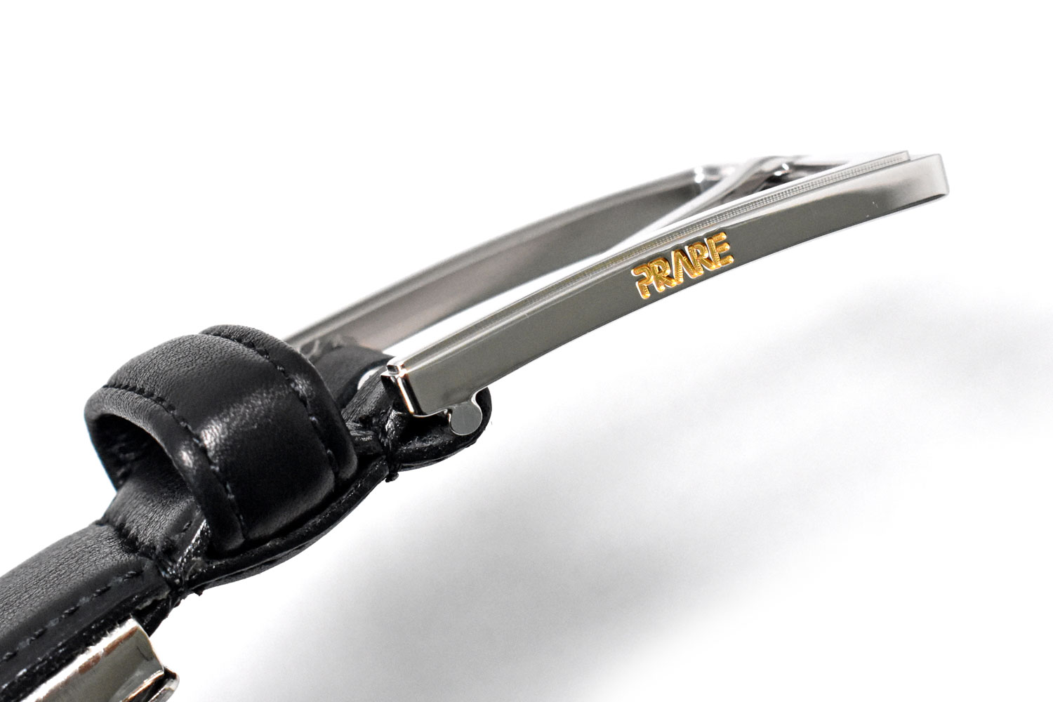 立体的で繊細なデザインの美錠(バックル)。側面には24K沈金仕上げのプレリーロゴ。