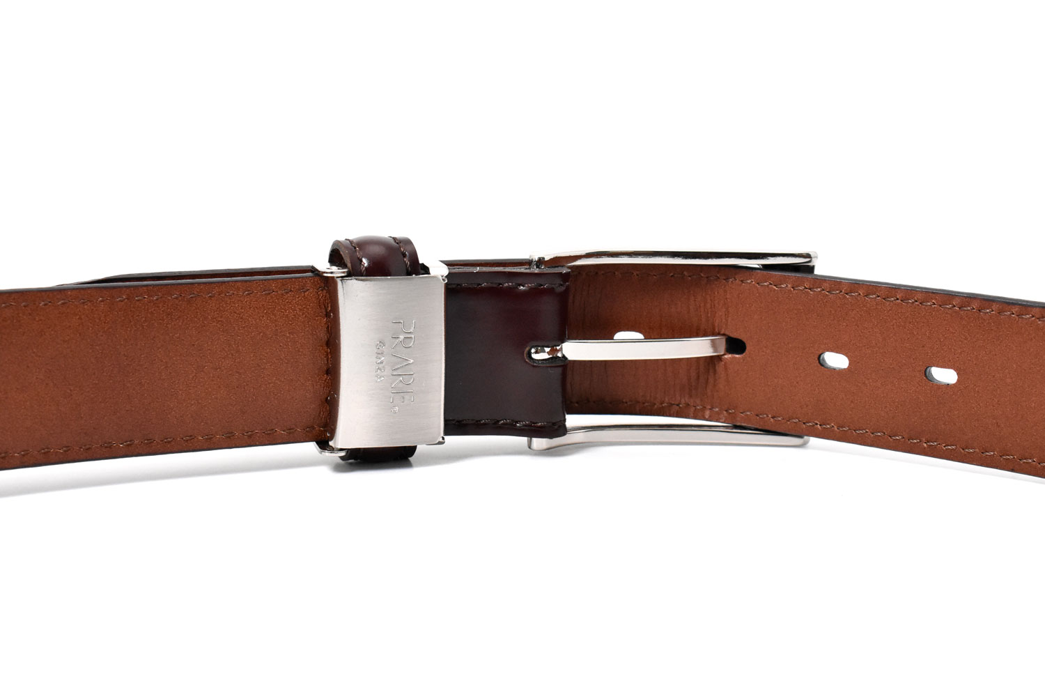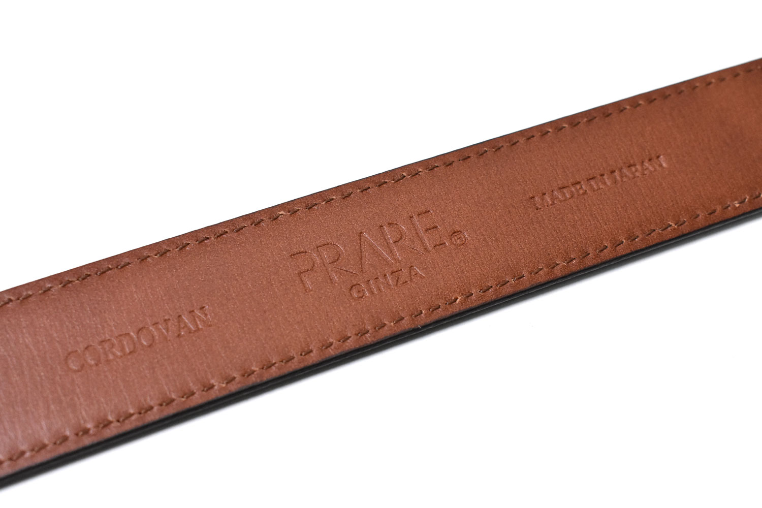 牛革などに比べ、曲げに強い分、ベルトとしては硬くなりがちなこの素材。プレリーでは、熟練した職人の経験から、適切な芯材の厚みを判断し、裏側のレザーを通常よりもしなやかに仕上げる事で、コードバンとの相性を良くしています。職人の技と経験がベルトとしての完成度を引き上げています。