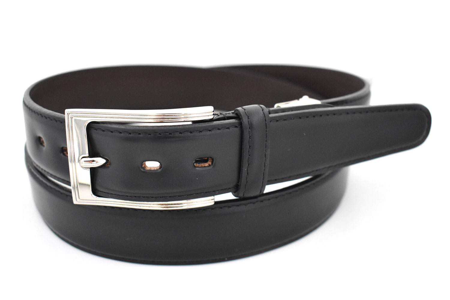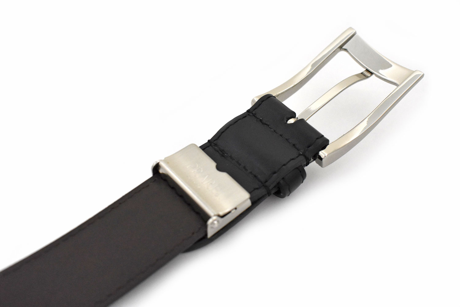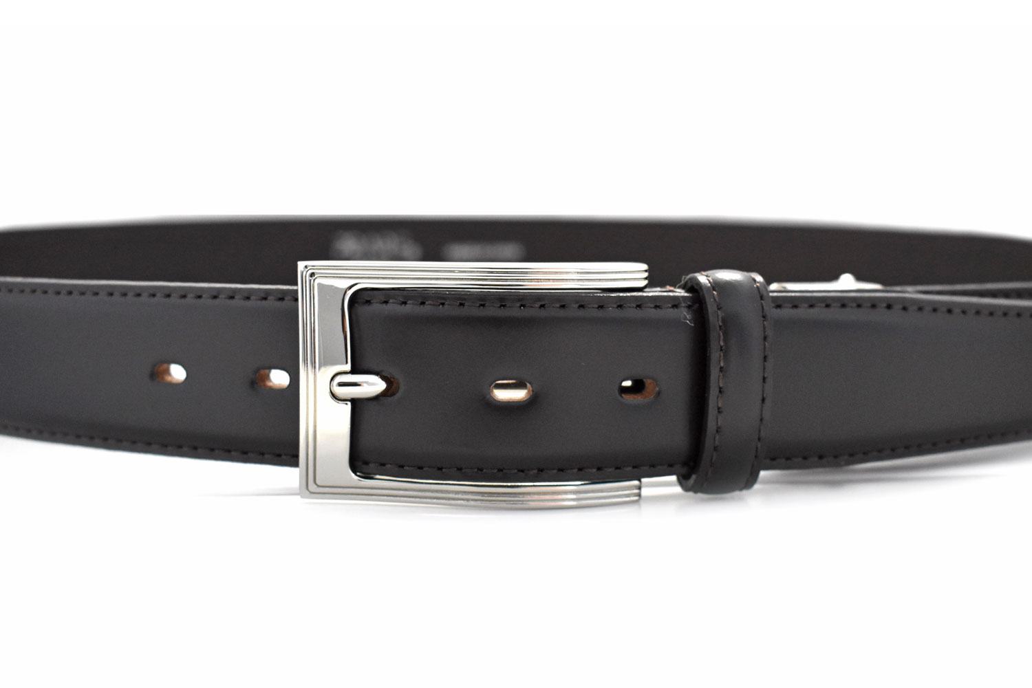 ベーシックなガラスレザーを使用したドレッシーなビジネスベルトです。スタイリッシュなイメージを醸し出す曲線とラインが特徴のバックルを合わせてシャープなスーツスタイルを演出します。裏面にはとてもしなやかな牛革を合わせて巻心地も抜群です。