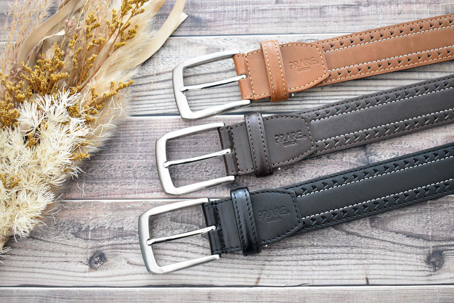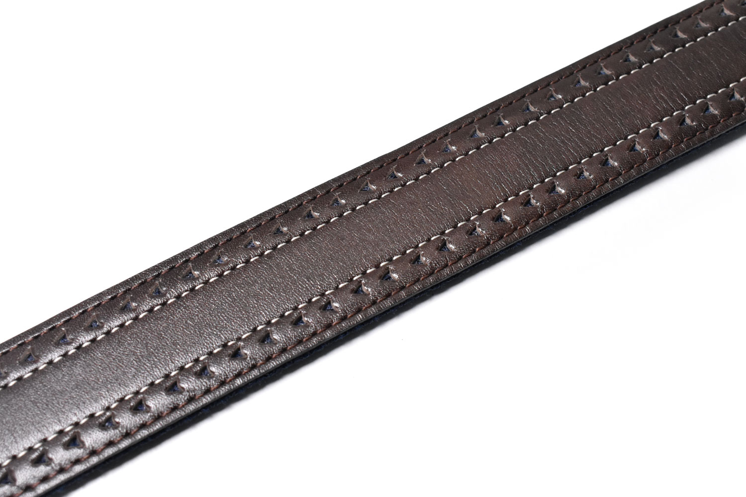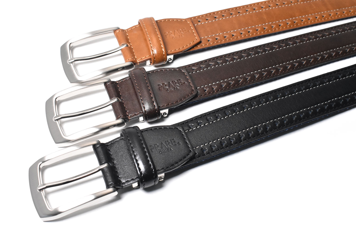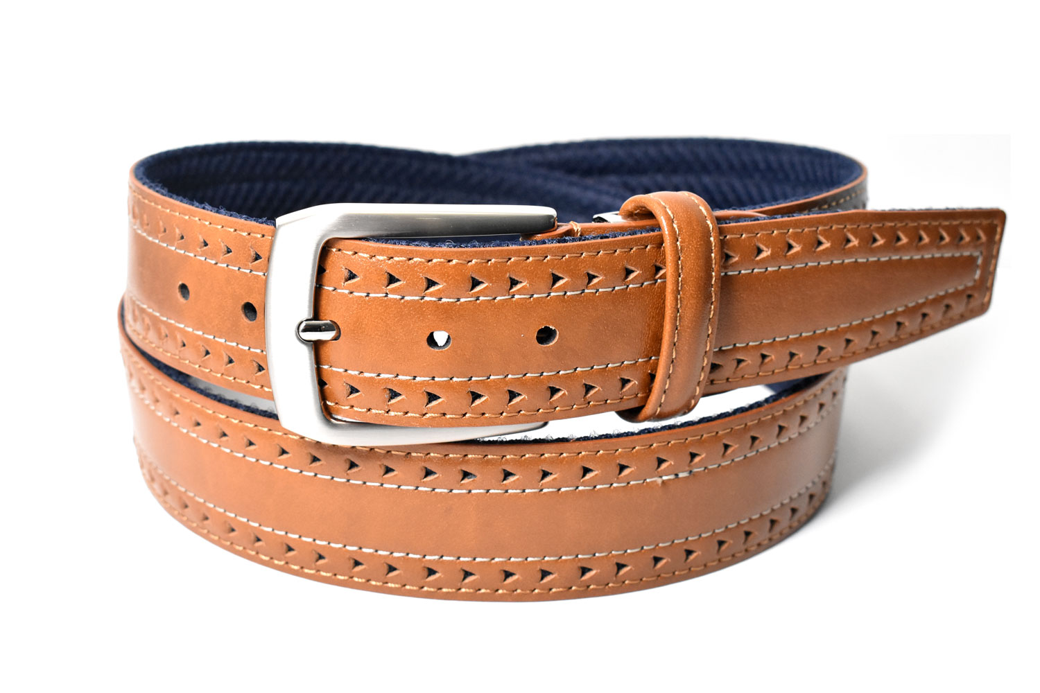 表から見るとパンチングされたレザーにベージュのステッチが効いたカジュアルベルト。
