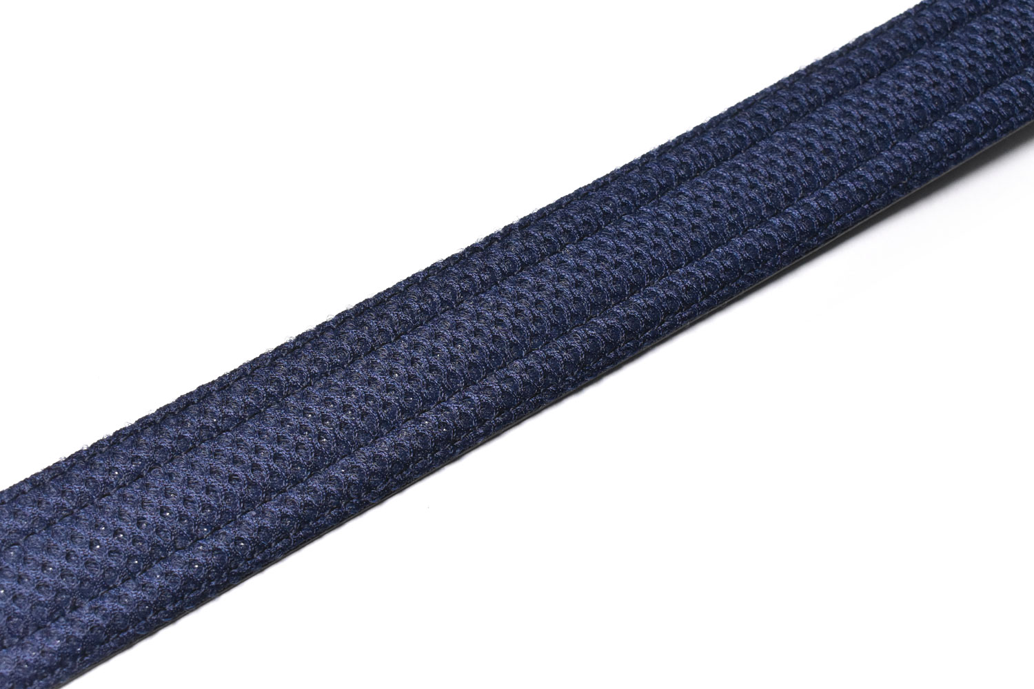 猛暑を快適に過ごすための夏用ベルト。表から見るとパンチングされたレザーにベージュのステッチが効いたカジュアルベルト。秘密は裏のメッシュの生地。「通気性が高くムレにくい」「軽量&ソフトで腰に優しい」「防臭抗菌加工で快適」3つの要素を満たしたメッシュ生地を採用した“クールメッシュベルト”。