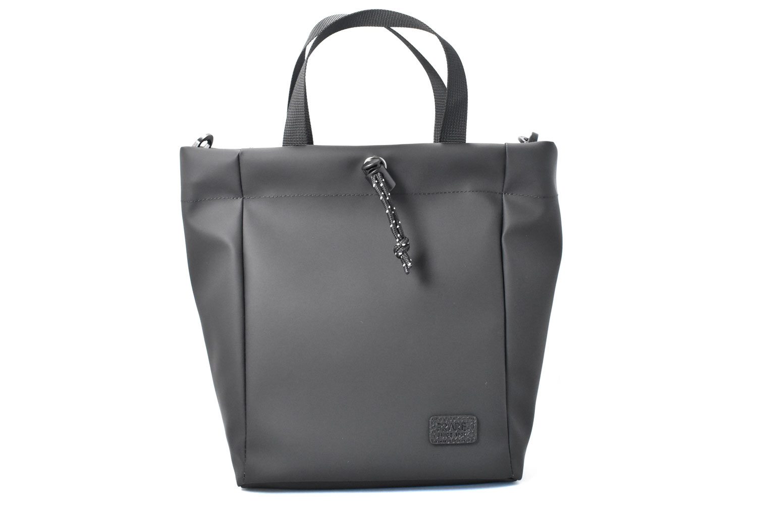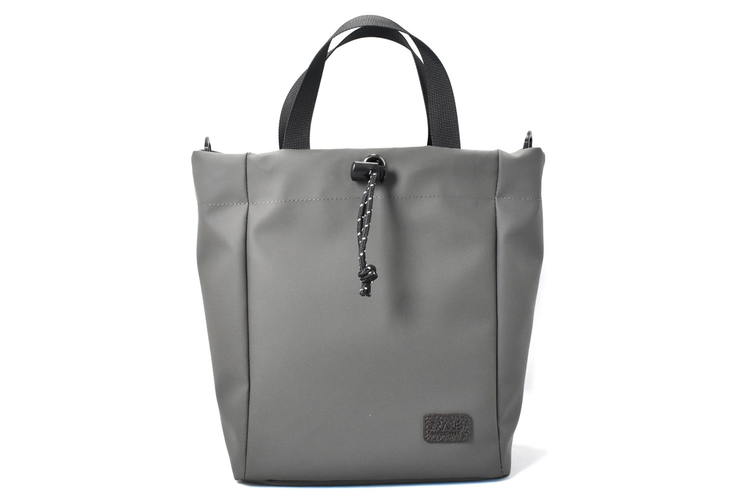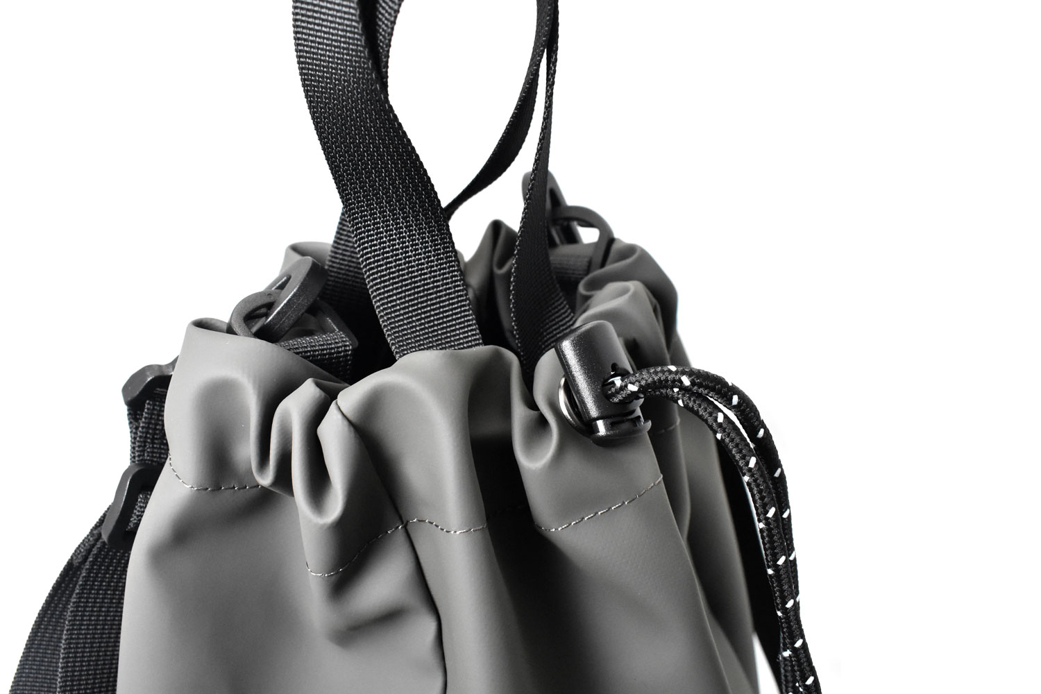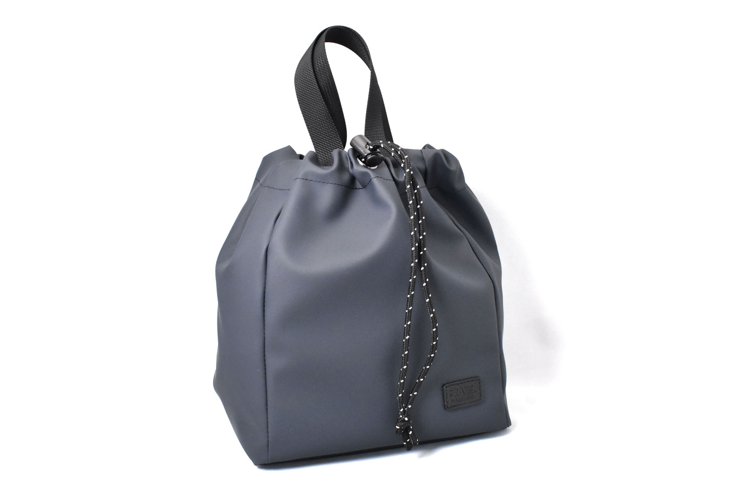 絞らずに手で持てばミニトート。付属のショルダーベルトを付けて絞れば巾着ショルダーバッグ。単色でマットな質感は、様々なコーデに合わせやすいです。