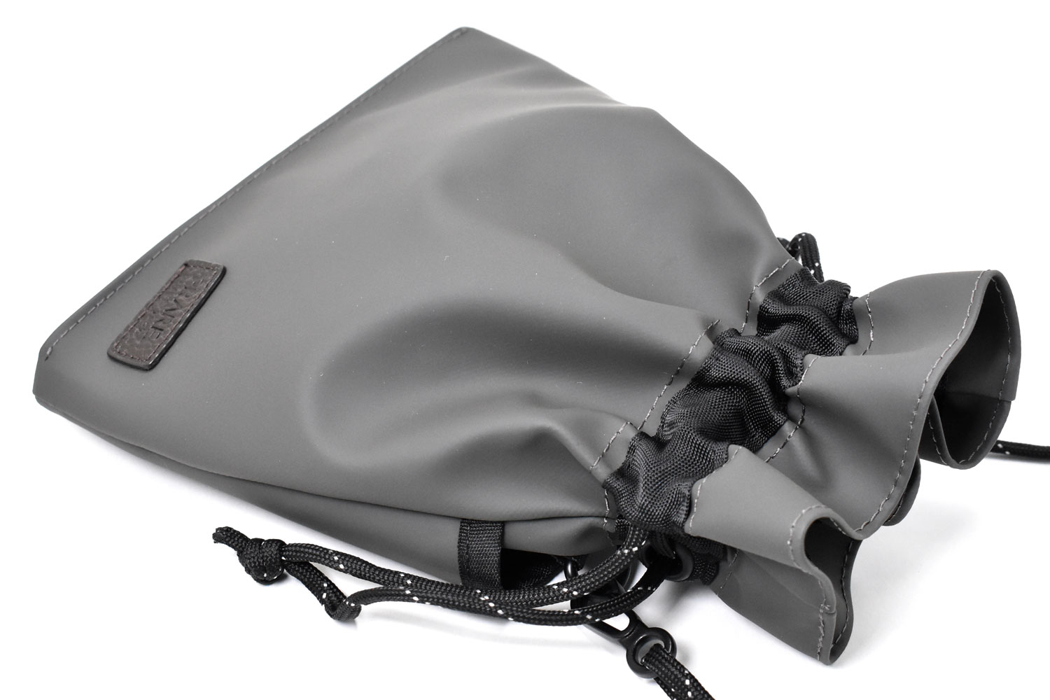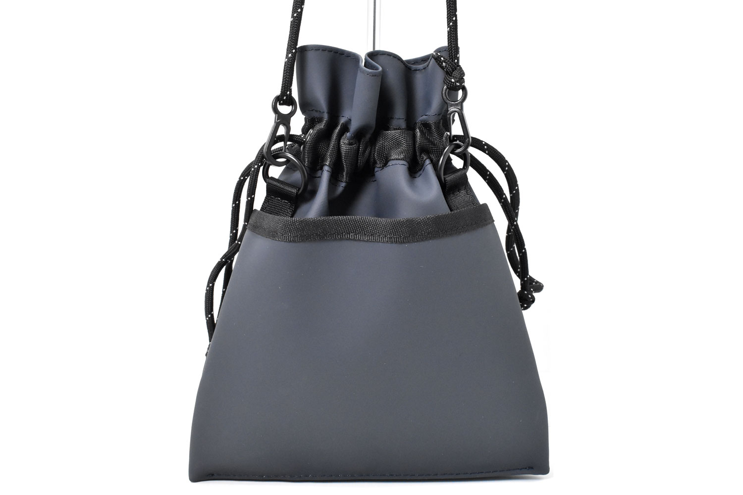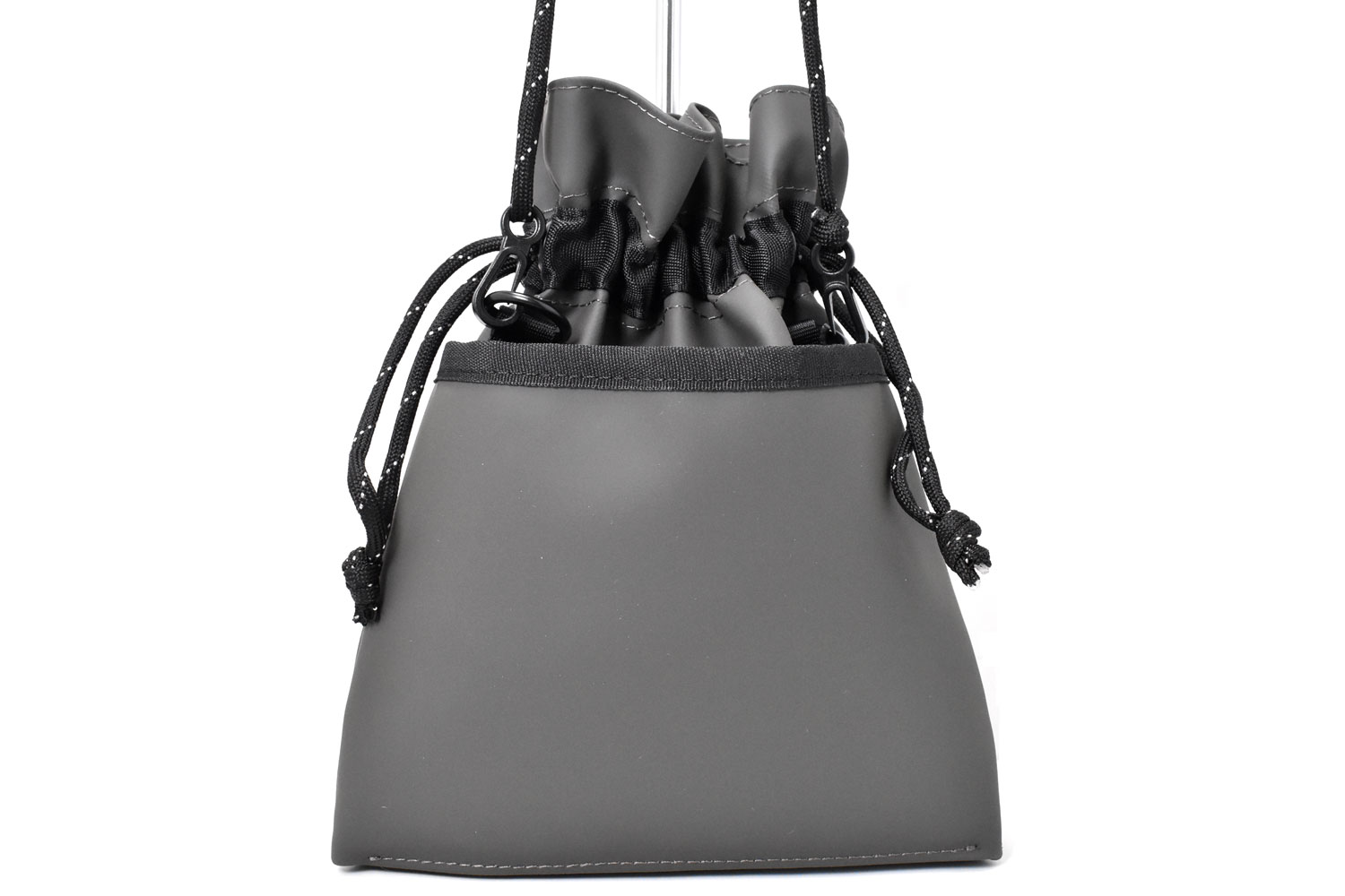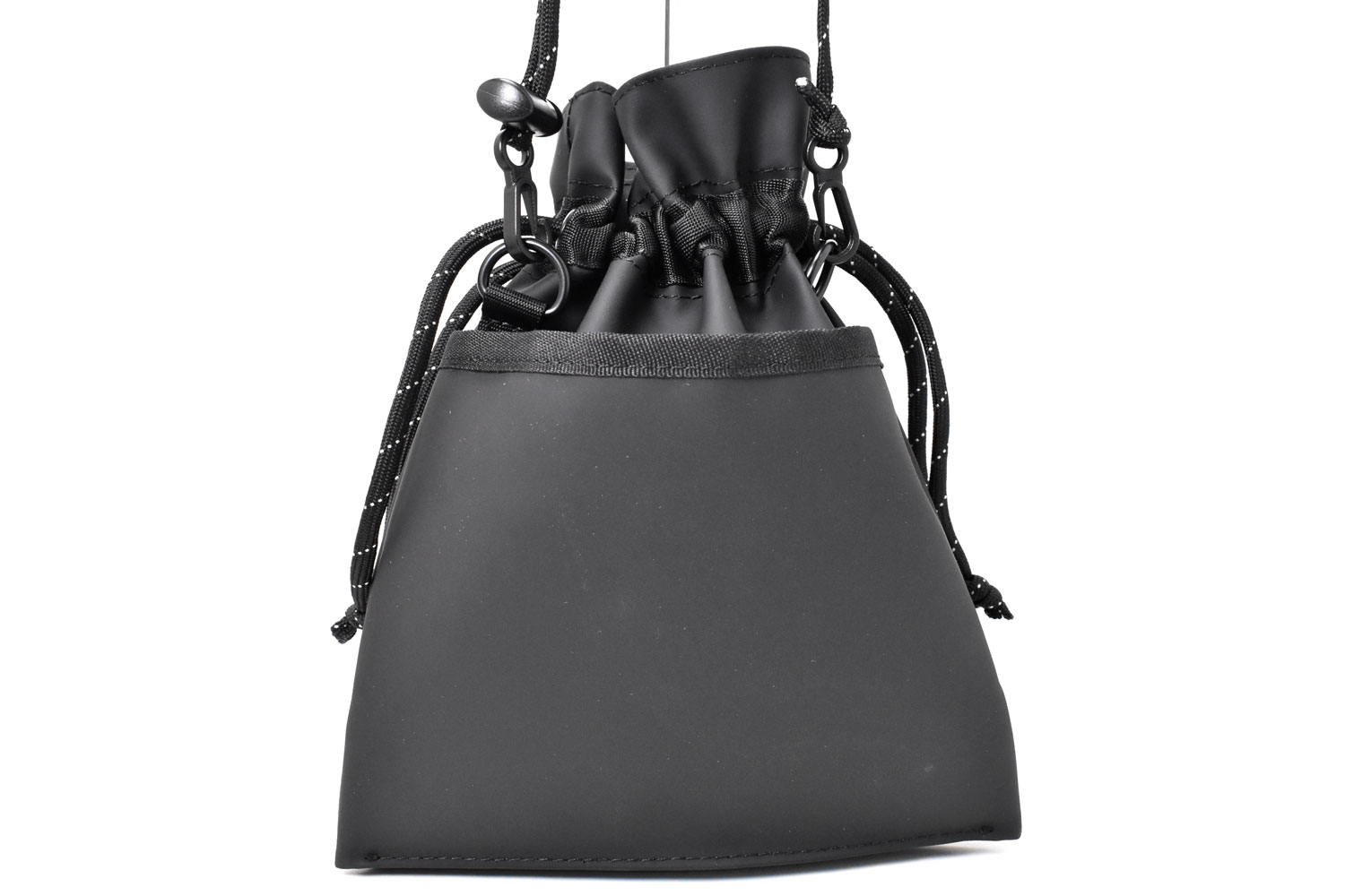 軽くて小さな巾着ショルダーバッグ。必要最低限の小物だけ持っていけるミニマムなサイズ感。ダークトーンのカラーでスタイリッシュなデザイン。男女でシェアできるアイテムです。
