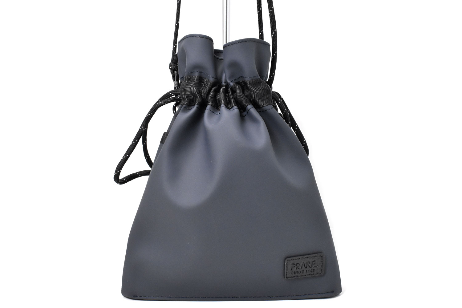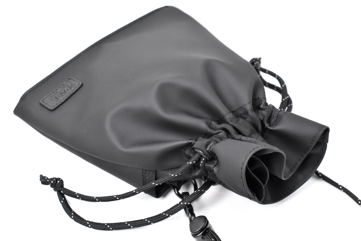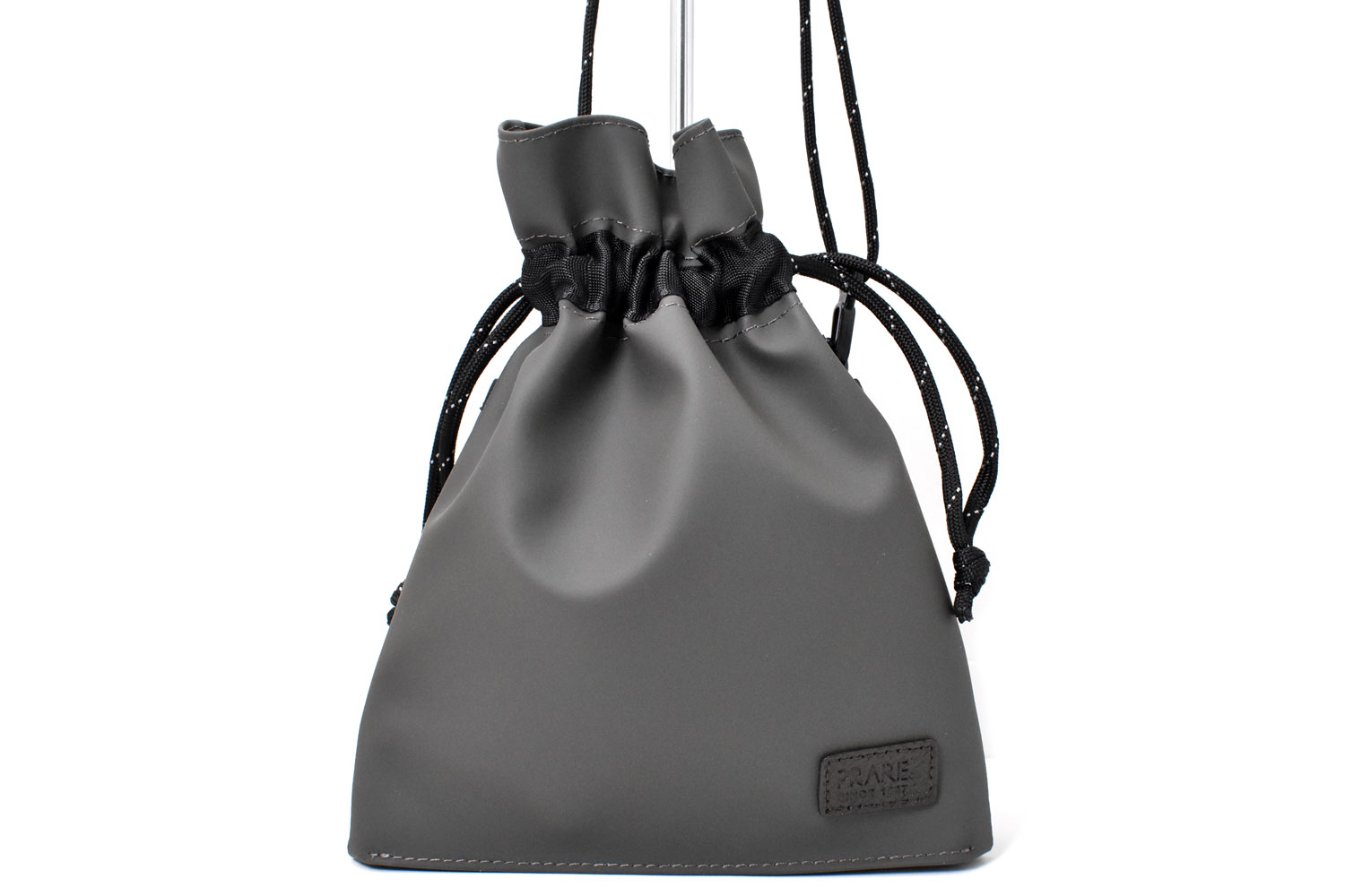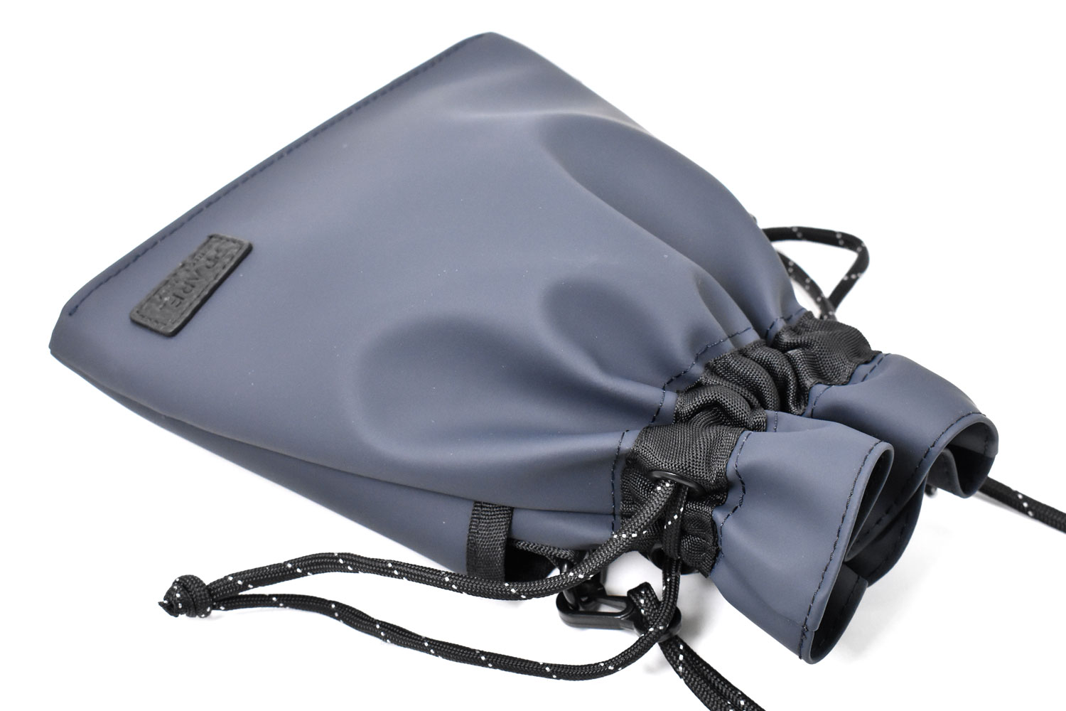 軽くて小さな巾着ショルダーバッグ。必要最低限の小物だけ持っていけるミニマムなサイズ感。ダークトーンのカラーでスタイリッシュなデザイン。男女でシェアできるアイテムです。
