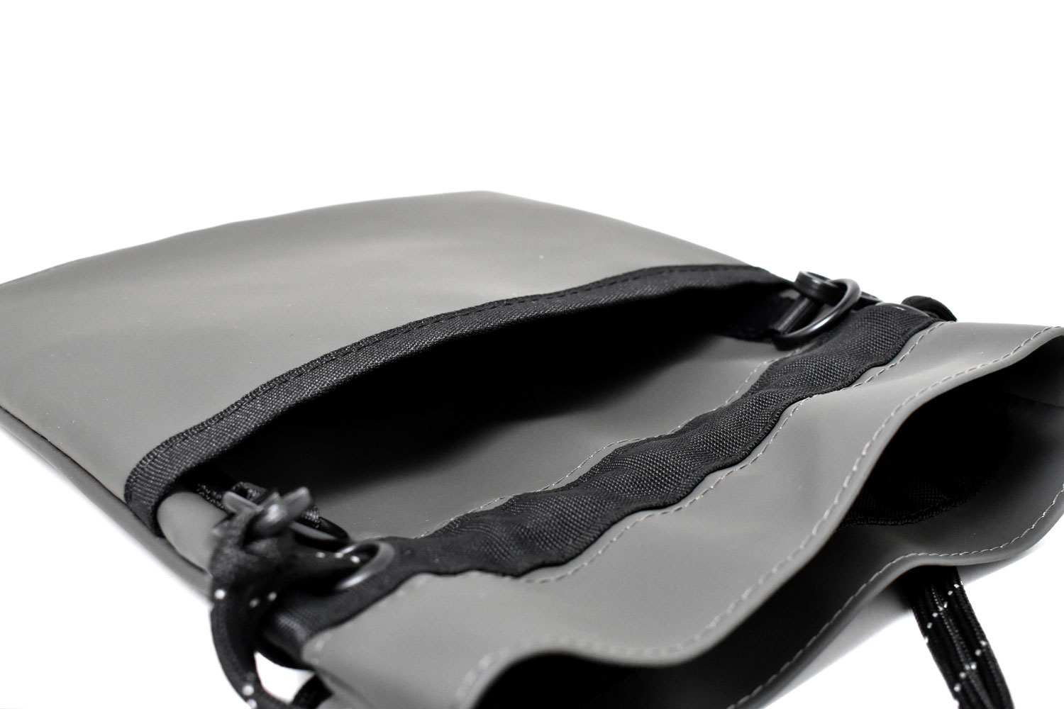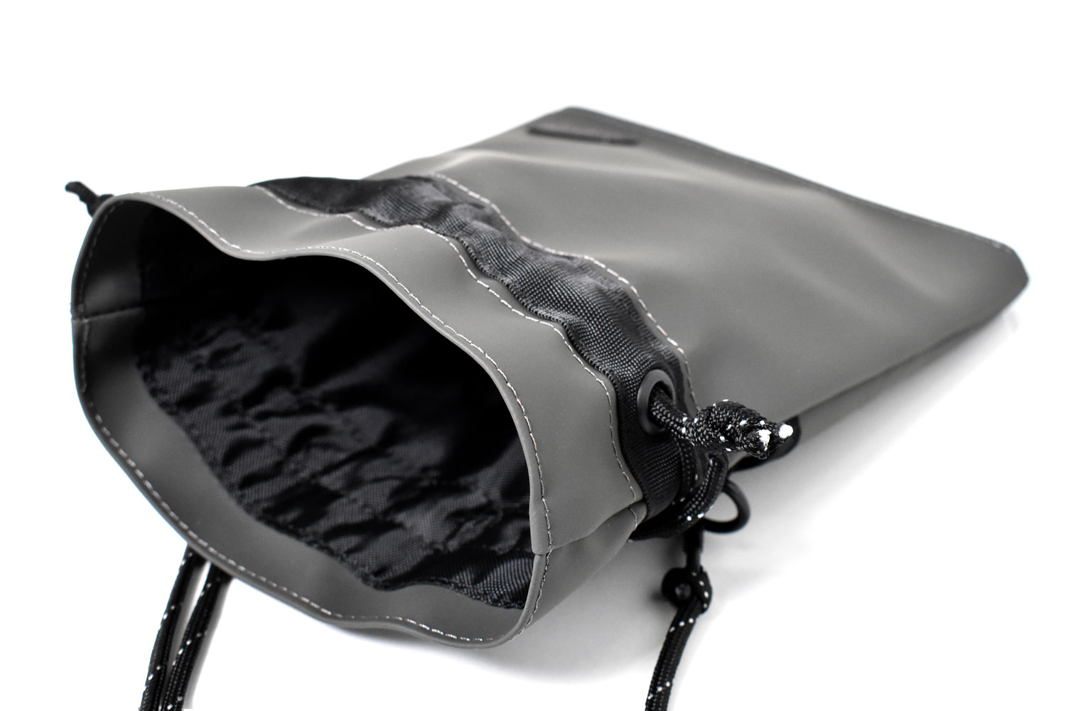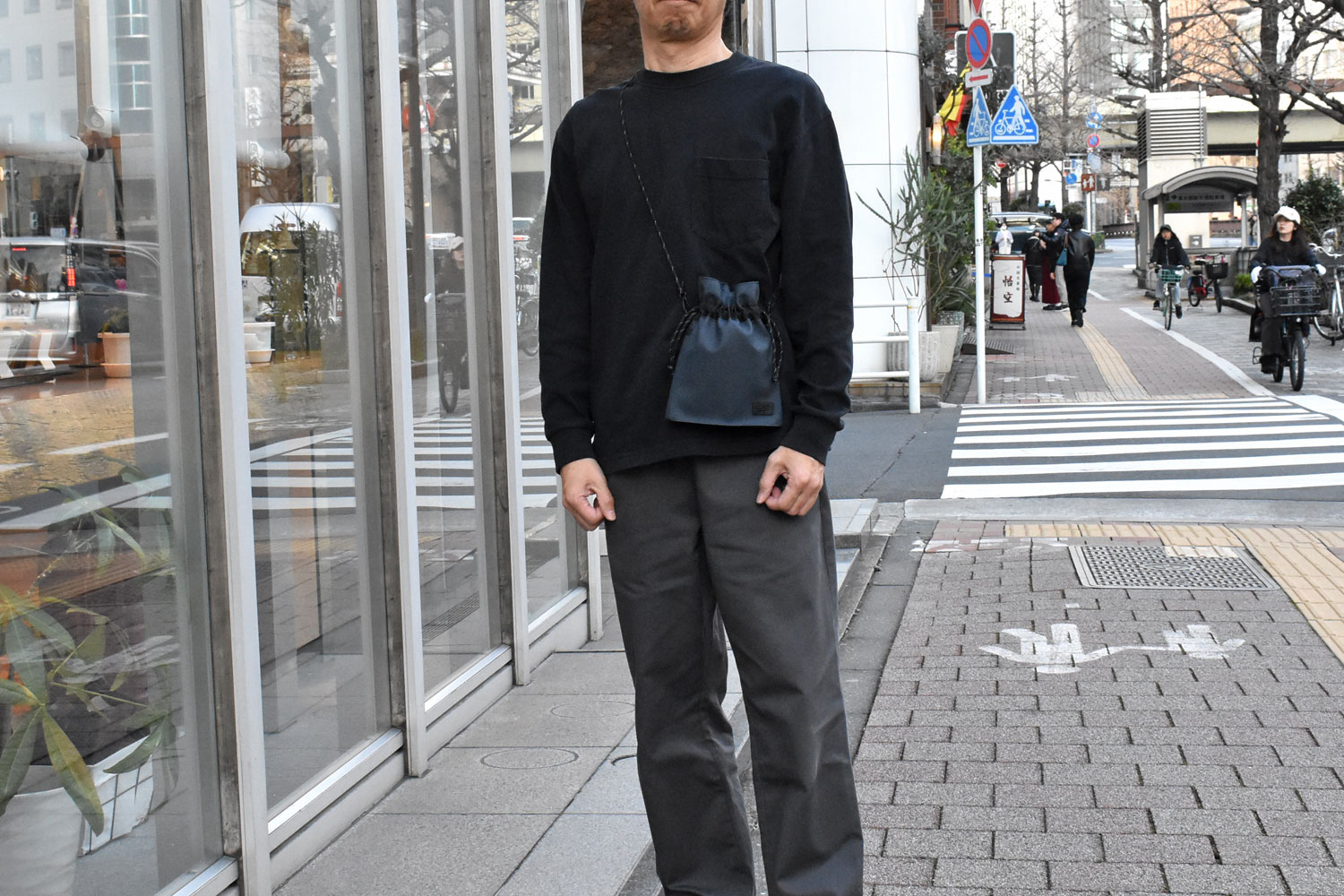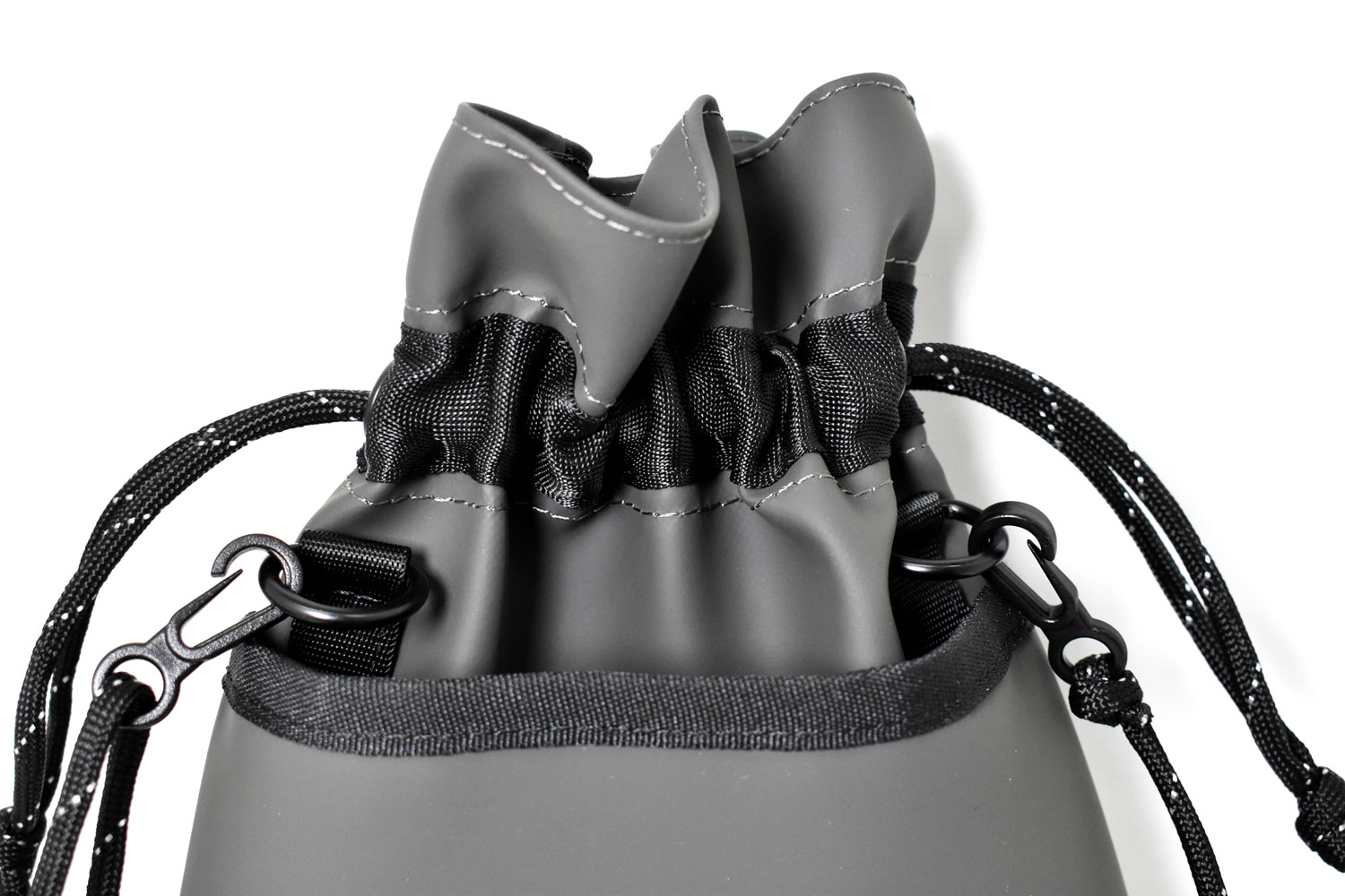 軽くて小さな巾着ショルダーバッグ。必要最低限の小物だけ持っていけるミニマムなサイズ感。ダークトーンのカラーでスタイリッシュなデザイン。男女でシェアできるアイテムです。