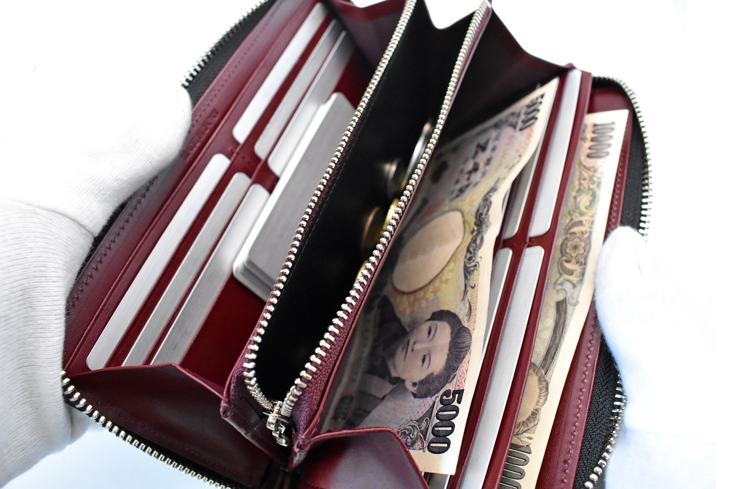 このラウンドファスナー長財布の最大の魅力は、品のある外観と、なんといっても収納力。