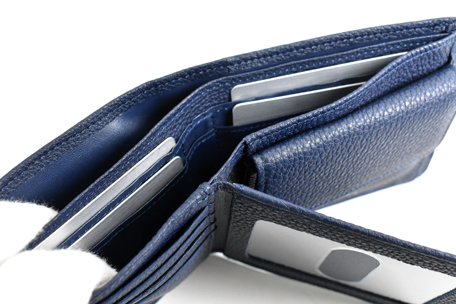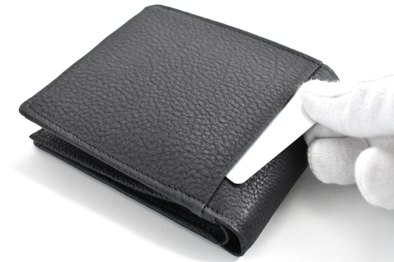 収納力の高さで人気のあるベラ付き二つ折り財布。この中ベラ、定期やIDカードなどを入れる窓付きのカード入れと、裏面にはカード室が3個付いています。