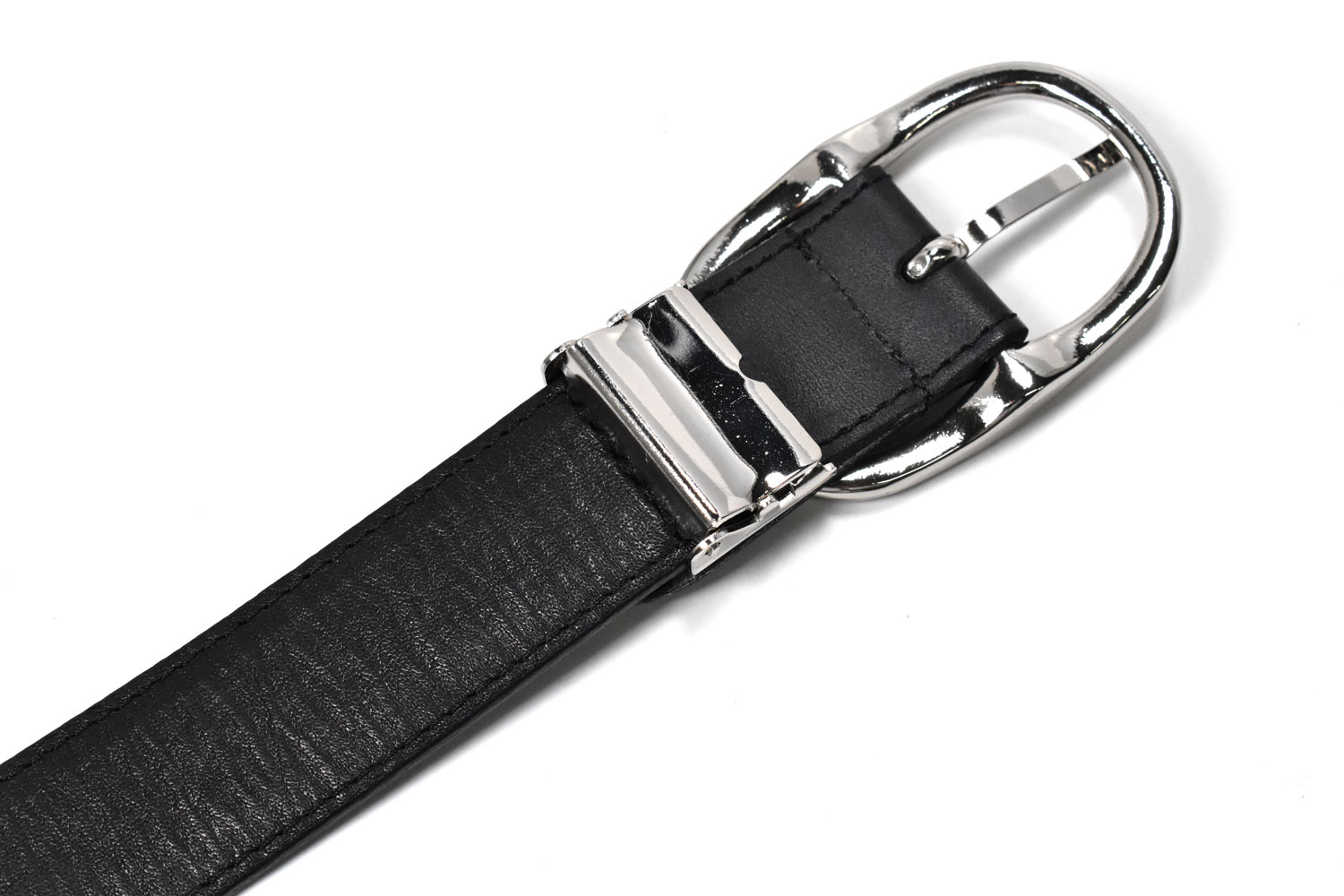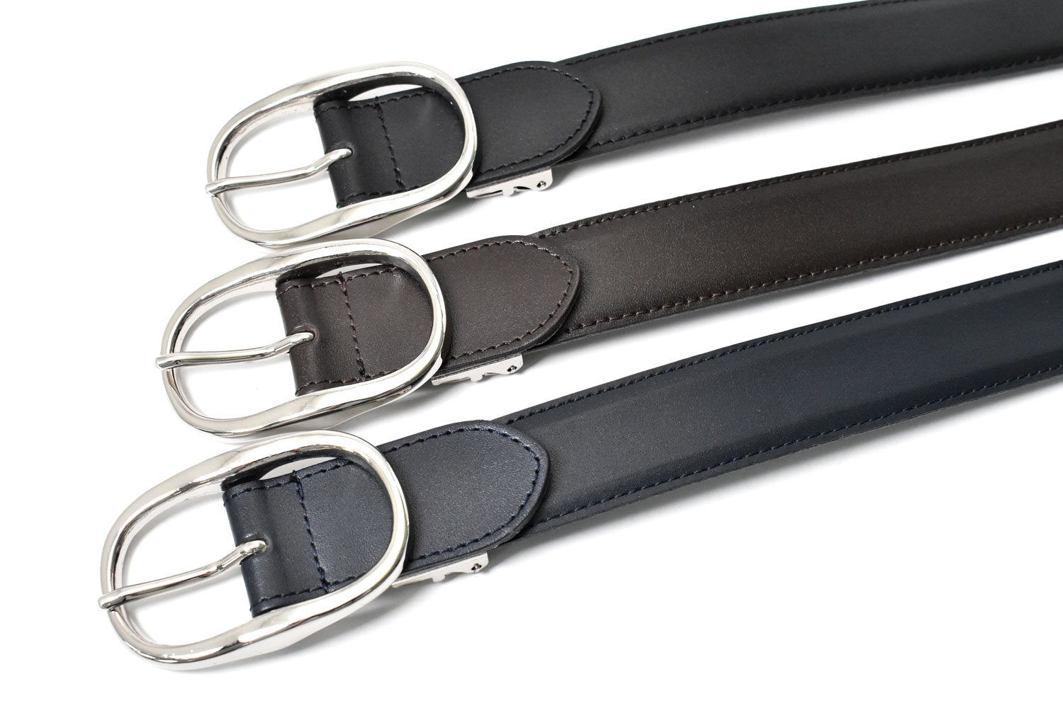 楕円形の個性的な真鍮製デザインバックル。スタイリッシュな雰囲気は、カジュアルシーンだけでなく、ジャケパン、スーツスタイルにと幅広く対応します。